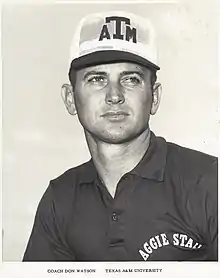 Donald Albert Watson (January 6, 1934 – January 7, 2020[1]) was an American football player and coach. He played college football at Texas A&M University (1954–1957), where he was one of the "Junction Boys", and later served as the assistant coach at his alma mater from 1965 to 1970. Watson was also the assistant coach at Virginia Tech (1957–1958), University of Houston (1960–1961), Tulane University (1962–1963), and the University South Carolina (1963–1964).