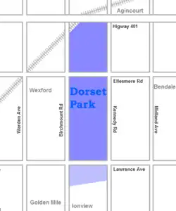 Dorset Park is a neighbourhood in Toronto, Ontario, Canada. It is located in the western part of the district of Scarborough. The neighbourhood is bordered by Highway 401 to the north, Midland Avenue to the east, Lawrence Avenue to the south, and Birchmount Road to the west. Kennedy Road runs along the neighbourhood's centre north and south and Ellesmere Road runs along the centre east and west. The area south of Lawrence Avenue, north of the hydro corridor, is known as McGregor Park and is often included as part of Dorset Park.
