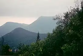 The mountain's two peaks are a north peak (3,489 ft or 1,063 m) and a south peak (3,455 ft or 1,053 m). From the north a trail from the Nesowednehunk Campground to the north peak is 3.1 miles (5.0 km) long and another 0.2 miles (0.32 km) to the south peak. From Foster Field, to the south, a 4-mile (6.4 km) trail leads to the summit. The last third of mile (0.53 km) is steep and climbs about 900 feet (270 m).[4] The north peak is wooded while the south peak is more open.