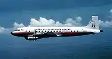Douglas continued to develop new aircraft, including the successful four-engined Douglas DC-6 (1946) and its last propeller-driven commercial aircraft, the Douglas DC-7 (1953). The company had moved into jet propulsion, producing its first for the U.S. Navy — the straight-winged F3D Skyknight in 1948 and then the more "jet age" style F4D Skyray in 1951. Douglas also made commercial jets, producing the Douglas DC-8 in 1958 to compete with the new Boeing 707.