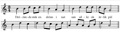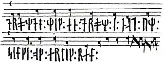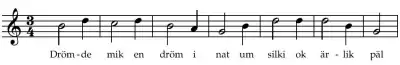Drømde mik en drøm i nat is the oldest known secular song in the Nordic countries, written around 1300. It is written in Old East Norse and is included in Codex Runicus, a transcript of Scanian Law where it forms a final note. Like the law itself, it is written in runes, and the tune is written on two simple staves in an early form of musical notation.[1] The song is sung in episode 6 of Vikings.