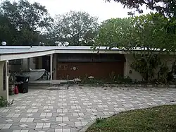 The building is solid concrete block with an irregular floor plan resting on a poured concrete slab. A crescent shaped driveway leads to the front (west) of the building. This view is dominated by a trapezoidal car port (2 car). The north and south elevations are fronted by patios with doors leading into a central room. The house has approximately 2,000 square feet of living space. The attached carport at the northwest end is 658 square feet. The roof is flat over the central "Florida room" and low pitched at the front and back. There are a variety of window forms including window walls, horizontal sliding windows and clerestory windows. The three bedroom home has two and a half baths, a kitchen a combination living/dining room and a Florida room.[2]