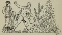 The Ismenian Serpent, of the spring of Ismene at Thebes, Greece, was slain by the hero Cadmus.[9] It was the offspring of Ares, who later turned the hero into a serpent.[10]