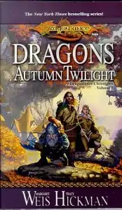 Dragons of Autumn Twilight is a 1984 fantasy novel by American writers Margaret Weis and Tracy Hickman, based on a series of Dungeons & Dragons (D&D) game modules.[1] It was the first Dragonlance novel, and first in the Chronicles trilogy, which, along with the Dragonlance Legends trilogy, are generally regarded as the core novels of the Dragonlance world. Dragons of Autumn Twilight details the meeting of the Companions and the early days of The War of the Lance. The novel corresponds with the first two Dragonlance game modules, Dragons of Despair and Dragons of Flame, but with a different ending.[2] It introduces many of the characters that are the subject of later novels and short stories.
