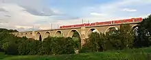 The route of the missing section between Freiberg and Chemnitz was more controversial. A connection through Hainichen had long been favoured. Ultimately, it was decided to build the shorter but more expensive route through Oederan, which had a steep ramp section and required the construction of several large viaducts. Between Flöha and Chemnitz, the line used the route of the Chemnitz–Annaberg railway, which had opened in 1866, and only the installation of a second track was necessary. On 1 April 1869 the Freiberg–Chemnitz section was opened, so that for the first time a connection existed between the eastern and the Western Royal Saxon State Railways in Saxony.[4] As a result, the now completed Dresden–Werdau railway became an important rail link between Silesia and Southern Germany.