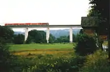 In the mid-1980s, the Hetzdorf Viaduct over the Flöha valley in the distinct of Mittelsachsen, which dated from the opening of that section of the line, had reached the end of its service life. In the final years, crossing the viaduct was only possible at a top speed of 20 km/h, which greatly restricted the section's capacity. Deutsche Reichsbahn eventually designed a straightened route bypassing the old viaduct. The new bridge consists of two prestressed concrete bridges, each 344 metres long, that cross the Hetzbach and Flöha valleys. The construction company VEB Autobahnbaukombinat ("Publicly Owned Operation for motorway construction combine") built the bridges from 1987 onwards using the incremental launch method, for the first time during the construction of a railway bridge in East Germany. The new line was completed and put into operation on 12 May 1992, shortening the connection between Dresden and Chemnitz by about one kilometre.[13][14][15]
