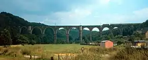 However, the planned extension from Tharandt to Freiberg turned out to be problematic. At first, the steep slopes between Tharandt and Freiberg were insuperable.[3] Ultimately, a route was selected along the Seerenbach Valley to Klingenberg with a maximum gradient of 1 in 40. Several large viaducts had to be built across the successive valleys of the Colmnitzbach, Bobritzsch and Freiberger Mulde rivers. By the time construction of this line started in 1859, rail engineers had acquired experience with steep haul operations on such inclines as the Schiefe Ebene and the Geislinger Steige. The line was opened to Freiberg on 11 August 1862.