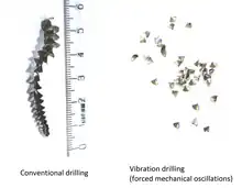 There are two main technologies of vibration drilling: self-maintained vibration systems and forced vibration systems. Most vibration drilling technologies are still at a research stage. In the case of self-maintained vibration drilling, the eigenfrequency of the tool is used in order to make it naturally vibrate while cutting; vibrations are self-maintained by a mass-spring system included in the tool holder.[6] Other works use a piezoelectric system to generate and control the vibrations. These systems allow high vibration frequencies (up to 2 kHz) for small magnitude (about a few micrometers); they are particularly suitable for drilling small holes. Finally, vibrations can be generated by mechanical systems:[7] the frequency is given by the combination of the rotation speed and the number of oscillation per rotation (a few oscillations per rotation), with magnitude about 0.1 mm.