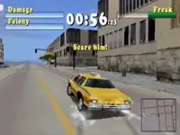 Gameplay from the PS1 release, in the mission "Taxi!" during the "Undercover" mode. Tanner is trying to scare someone sufficiently, indicated by the "Freak" meter.
