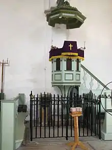 Augusta was buried under the floor of Kullamaa church.[31] On her tombstone is the text: "Hic jacet in pace Augusta Carolina Friderica Luisa Ducis Brunsuicencis-Guelferbytani Filia Friderici Guilielmi Caroli Ducis Vurtembergensis et Supremi Praefecti Viburgiensis Uxor Nat. d. III. Dec. MDCCLXIV Denat. d. XIV. Sept. MDCCLXXXVIII"[32][33] The date is false - it should have been XVI September. Over the years, her coffin decayed, causing her bones to get lost in the bottom of the deep crypt. Her tombstone is still in the church, albeit in a different position, surrounded by an iron rail.[34]