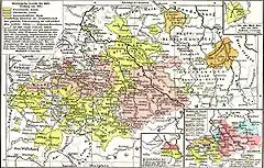Wettin lands with eastern Żagań exclave (orange) in 1485. In 1549, Maurice of Saxony exchanged it with Ferdinand I, Holy Roman Emperor for some minor Bohemian lands.