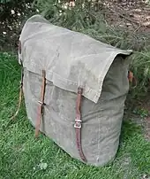 A Duluth pack is a specialized type of backpack made of heavy canvas, leather, and/or cordura nylon. The packs are a traditional portage pack which are nearly square in order to fit easily in the bottom of a canoe.[1] The simplest and most traditional Duluth pack comprises a single large envelope which is closed by straps and roller buckles. The pack is carried by two shoulder straps, and sometimes a tumpline worn over the top of the head.[2][3]