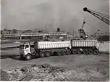 The dump truck is thought to have been first conceived in the farms of late 19th century western Europe. Thornycroft developed a steam dust-cart in 1896 with a tipper mechanism.[1] The first motorized dump trucks in the United States were developed by small equipment companies such as The Fruehauf Trailer Corporation, Galion Buggy Co. and Lauth-Juergens among many others around 1910.[2] Hydraulic dump beds were introduced by Wood Hoist Co. shortly after. Such companies flourished during World War I due to massive wartime demand. August Fruehauf had obtained military contracts for his semi-trailer, invented in 1914 and later created the partner vehicle, the semi-truck for use in World War I. After the war, Fruehauf introduced hydraulics in his trailers. They offered hydraulic lift gates, hydraulic winches and a dump trailer for sales in the early 1920s. Fruehauf became the premier supplier of dump trailers and their famed "bathtub dump" was considered to be the best by heavy haulers, road and mining construction firms.[3][4][5]