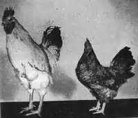 The reciprocal crosses made between normal sized chickens with Bantams revealed that Bantams carry one or several sex-linked dominant genes that reduce body size.[21][22] This mutation is present in Sebright Bantams and probably other bantams. This mutation is thought to be an allele at the Dw locus and to be different from the allele dw.[23]