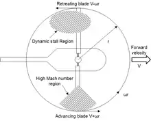 The dynamic stall is one of the hazardous phenomena on helicopter rotors, which can cause the onset of large torsional airloads and vibrations on the rotor blades.[1][2] Unlike fixed-wing aircraft, of which the stall occurs at relatively low flight speed, the dynamic stall on a helicopter rotor emerges at high airspeeds or/and during manoeuvres with high load factors of helicopters, when the angle of attack(AOA) of blade elements varies intensively due to time-dependent blade flapping, cyclic pitch and wake inflow. For example, during forward flight at the velocity close to VNE, velocity, never exceed, the advancing and retreating blades almost reach their operation limits whereas flows are still attached to the blade surfaces. That is, the advancing blades operate at high Mach numbers so low values of AOA is needed but shock-induced flow separation may happen, while the retreating blade operates at much lower Mach numbers but the high values of AoA result in the stall (also see advancing blade compressibility and retreating blade stall).