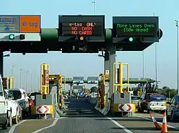 At conventional toll plazas, in lanes marked with the e-tag sign, overhead equipment register and verify the details of an e-tag in a slow-moving vehicle, and an amount is deducted from the road user's toll account, whereupon the boom lifts,[1] or a light turns green.