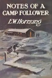 In July 1917 Hornung's poem, "Wooden Crosses", was published in The Times,[59][lower-alpha 15] and in September, "Bond and Free" appeared.[61] Towards the end of the year, he was accepted as a volunteer in a YMCA canteen and library "a short distance behind the Front Line".[62] During his service in Arras, in February 1918 he borrowed a staff car from a friend and visited his son's grave near Ypres, before returning to the library in Arras.[63] Hornung was concerned about support for pacifism among troops, and wrote to his wife about it. When she spoke to Doyle about the matter, rather than discussing it with Hornung he informed the military authorities. Hornung was angered by Doyle's action, and "told him there was no need for him to 'butt in' except for his own 'satisfaction'." Relations between the two men were strained as a result.[64] Hornung continued to work at the library until the German spring offensive in March overran the British positions and he was forced to retreat, firstly to Amiens and then, in April, back to England. He stayed in England until November 1918, when he again took up his YMCA duties, establishing a rest hut and library in Cologne.[65] In 1919 Hornung's account of his time spent in France, Notes of a Camp-Follower on the Western Front, was published. Doyle later wrote of the book that "there are parts of it which are brilliant in their vivid portrayal",[66] while Hornung's biographer, Alison Cox, described the book as "one of the best records of the war as experienced on the front lines".[58] That year Hornung also published his third and final volume of poetry, The Young Guard.[58]
