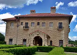 The Marland Mansion was built on the side of a small hill, higher on the west side than on the east, in an abandoned stone quarry that determined the placement for the mansion, as the excavations for the quarry was used for the construction of the swimming pool. Designed by prominent Tulsa architect John Duncan Forsyth, the mansion was constructed between 1925 and 1928, and influenced by the Palazzo Davanzati in Florence, Italy that Marland had visited while traveling in Europe. Crafted from light-colored, rusticated limestone blocks, quarried on-site, and set in concrete on a steel frame, the roughly u-shaped layout is 78 feet wide and 184 feet long. The main entrance is found on the west front and features an arched and buttressed porte-cochère with gabled, clay tiled roof, that shelters the arched, 11-panel, double wood entrance doors custom-made in New York. Under each of the four inside corners of the porte-cochère are sculptures of Marland's four hunting dogs, carved by Italian sculptor, Ernest G. Pellegrini. The windows with black painted metal surrounds, to contrast with the light colored stone, are asymmetrically arranged. The first level windows feature wrought iron grill work, while those on the second level are smaller, or have wrought iron balconies.[3]