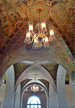 Accessed by a curved double staircase in the entrance hall, a multiple arched loggia with vaulted ceilings, featuring hand painted chinoiserie canvases, and a terrazzo floor with each tile individually poured between brass dividers, runs through the center of the house to the ballroom. Flanking the loggia are the sun room and living room where Marland displayed his collection of tapestries, paintings and works of art. The spacious ballroom features an ornate coffered ceiling that was gilded in $80,000 of gold leaf, and lit from imported Waterford crystal chandeliers with wrought iron bases that originally cost $15,000 each. To replace the ceiling and chandeliers today would cost an estimated $2 million. On the north wall are family portraits surrounding a large fireplace.[4]