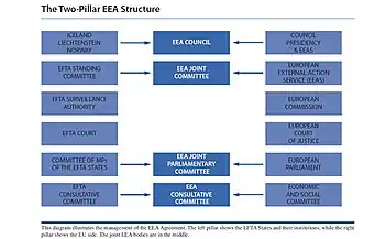 The two-pillar structure is necessary because the EEA EFTA States have not transferred any competences regarding surveillance and judicial review to the EU.[4] In order for decisions made by EU institutions to apply to the EEA EFTA States, certain competences and tasks which are carried out by bodies in the EU pillar have to be conferred upon bodies in the EFTA pillar.