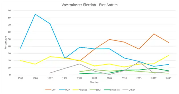 The main interest in Westminster Elections has been the contest between the Ulster Unionist Party and the Democratic Unionist Party. In 1983 the UUP were only 367 votes ahead of the DUP. As part of a pact to oppose the Anglo-Irish Agreement the DUP did not contest the seat until 1992 but they still failed to come close, though in the 1996 elections to the Northern Ireland Forum they were only slightly behind the UUP. But in the 2001 general election they achieved an astonishing result when they came with 128 votes of winning the Westminster seat, despite not having targeted it. In the 2003 Assembly election they followed this up by gaining two additional MLAs and outpolling the UUP for the first time.