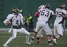 In Montgomery's first season, the Pirates compiled a record of 3–9.[111] The Pirates won their first two games of the season, defeating FCS opponent Western Carolina by a margin of 52–7[112] and archrival NC State by a score of 33–30.[113] However, Montgomery's squad dropped their next five, beginning with a 20–15 loss to South Carolina.[114] On September 24, East Carolina lost to Virginia Tech by a score of 54–17.[115] That was followed by a 47–29 loss to UCF.[116] On October 8, Montgomery's Pirates lost to South Florida by a score of 38–22.[117] The Pirates were scheduled to host Navy on October 13, but due to Hurricane Matthew battering the North Carolina coast that weekend, the game was rescheduled for November 19.[118] After a 31–19 loss to Cincinnati,[119] the Pirates snapped their five-game skid by dominating UConn to the tune of 41–3.[120] East Carolina lost their last four games to finish the season; falling to Tulsa by a score of 45–24,[121] SMU by a margin of 55–31,[122] Navy by a score of 66–31[123] and Temple by a score of 37–10.[124]
