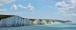 The north-east of East Sussex is part of the Weald, a sandstone anticline that was once an extensive woodland. The highest point in this area is Crowborough Hill (242 m (794 ft)), part of the High Weald uplands. The south-west of the county is part of the South Downs, a rolling chalk escarpment that stretches west into West Sussex and Hampshire. Ditchling Beacon (248 m (814 ft)) is the highest point. Where the downs reach the sea, they form high cliffs such as the Seven Sisters, where eroded dry valleys create an undulating skyline.[6] The county does not contain large rivers, but its largest are the Rother, which forms part of the boundary with Kent, the Cuckmere, and the Ouse, which rises in West Sussex and flows through Lewes before reaching the English Channel at Newhaven.[7]