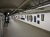 In the eastern mezzanine are architectural ornaments from the Brooklyn Museum collection, installed during the 2003 renovation of the station.[50] The station contains 78 ornaments, which include cornices and statues salvaged from demolished buildings.[33] The platforms and the eastern mezzanine formerly displayed abstract art paintings created in 1991 by artist Pat Steir, collectively called the Brueghel Series.[51]