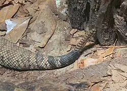 Other common names for this snake species include eastern diamond-backed rattlesnake,[5] eastern diamondback,[4] diamond rattlesnake, diamond-back rattlesnake, common rattlesnake, diamond-back, diamond(-patch) rattler, eastern diamond-back (rattlesnake), eastern diamond rattlesnake, Florida diamond-back (rattlesnake), Florida rattlesnake, lozenge-spotted rattlesnake, rattler, rattlesnake, southeastern diamond-backed rattlesnake, southeastern diamond-backed rattler, southern woodland rattler, timber rattler, water rattle, water rattlesnake,[17] and diamondback rattlesnake.[3]