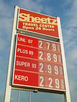 Sign showing gas prices in front of Sheetz in Mount Jackson, Virginia, on August 31, 2005, just as Hurricane Katrina began to make its mark on the price of gasoline. Prices had risen thirty cents since the previous day, and would rise an additional twenty cents before the day was over.