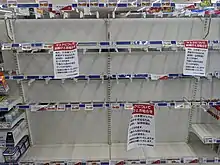 The pandemic has impacted the retail sector. Shopping centres around the world responded by reducing hours or closing down temporarily. As of 18 March 2020, the footfall to shopping centres fell by up to 30%, with significant impact in every continent.[156] Additionally, product demand exceeded supply for many consumables, resulting in empty retail shelves.[157][158] In Australia, the pandemic has provided a new opportunity for daigou shoppers to re-sell into the China market. "The virus crisis, while frightening, has a silver lining".[159][160]
