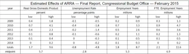 The Congressional Budget Office and a broad range of economists credit Obama's stimulus plan for economic growth.[34][35] The CBO's final analysis in February 2015 found that ARRA provided substantial improvement to GDP growth and employment.[36]