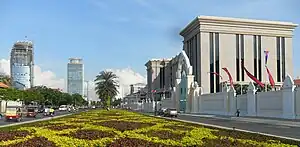 The economy of Cambodia (Khmer: សេដ្ឋកិច្ចនៃកម្ពុជា [setʰakəc nəj kampuciə]) currently follows an open market system (market economy) and has seen rapid economic progress in the last decade.[18] Cambodia had a GDP of $28.54 billion in 2022.[19] Per capita income, although rapidly increasing, is low compared with most neighboring countries. Cambodia's two largest industries are textiles and tourism, while agricultural activities remain the main source of income for many Cambodians living in rural areas.[20] The service sector is heavily concentrated on trading activities and catering-related services. Recently, Cambodia has reported that oil and natural gas reserves have been found off-shore.[21]