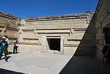 The largest and most important archeological site is Monte Albán, which was capital of the Zapotec empire.[21] It is located 400 meters above the valley floor, just outside the city of Oaxaca. The buildings are aligned with the cardinal directions and the movement of the stars, with the idea of creating a place that would be a meeting point between heaven and earth. While the main ceremonial center has been excavated, there still remains many kilometers square of site to explore.[1] Located at the eastern end of the Central Valleys, another major archaeological site is the ancient Zapotec center of Mitla, which in the Zapotec language originally meant "place of the Dead." Mitla is famous for its unique ancient stone fretwork. These mosaics are completely abstract with no representations of animals or humans.[1][21]