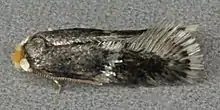 The wingspan is 5–6 mm. The head is orange and the forewings are dark brownish with a broken creamy fascia. Adults are on wing in June.