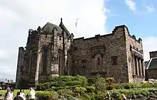 Malcolm's youngest son, King David I (r.1124–1153), developed Edinburgh as a seat of royal power principally through his administrative reforms (termed by some modern scholars the Davidian Revolution).[40] Between 1139 and 1150, David held an assembly of nobles and churchmen, a precursor to the parliament of Scotland, at the castle.[38] Any buildings or defences would probably have been of timber,[41] although two stone buildings are documented as having existed in the 12th century. Of these, St. Margaret's Chapel remains at the summit of the rock. The second was a church, dedicated to St. Mary, which stood on the site of the Scottish National War Memorial.[41] Given that the southern part of the Upper Ward (where Crown Square is now sited) was not suited to be built upon until the construction of the vaults in the 15th century, it seems probable that any earlier buildings would have been located towards the northern part of the rock; that is around the area where St. Margaret's Chapel stands. This has led to a suggestion that the chapel is the last remnant of a square, stone keep, which would have formed the bulk of the 12th-century fortification.[42] The structure may have been similar to the keep of Carlisle Castle, which David I began after 1135.[43]