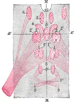 Figure showing the different groups of cells, which constitute, according to Perlia, the nucleus of origin of the oculomotor nerve.
