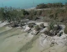 At Lake Harbor, a tiny lakefront community near the western boundary of Palm Beach County, only seven homes were left standing after the hurricane.[95] About 743 homes[92] – roughly 80% of the dwelling in South Bay – were damaged,[93] and 63 residences were destroyed.[92] The city hall and the fire station suffered heavy roof damage.[96] In Canal Point, trees, branches, power lines, and electrical poles were toppled. Almost complete destruction of the community's mobile homes parks occurred. Several other homes and buildings were inflicted with serious damage.[89] Overall, damage occurred at about 60% of homes in Canal Point.[94] Some historical buildings damaged by hurricanes Frances and Jeanne in 2004 were destroyed by Wilma.[97] State Road 80, one of the only routes between eastern and western Palm Beach County, was closed after a Florida Power & Light transmission line fell across the highway about 1 mi (1.6 km) west of Lion Country Safari.[91] At the Loxahatchee National Wildlife Refuge (NWR), 85% of tree islands – "small, wetland forest communities imbedded in a matrix of freshwater marsh" – were damaged by the storm. Less than 50% of the canopies were removed at most tree islands, while the tree islands that suffered the worst impact had larger trees and were near the center of Loxahatchee NWR.[98] The office and visitor centers were both severely damaged and later rebuilt.[99]