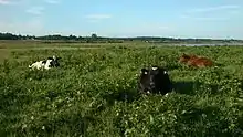 The wet meadows at the lake brinks are grazed by cattle.
