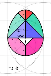 Construction of the Egg of Columbus "tangram" puzzle with dimensions – some versions split the white triangle along the dotted line