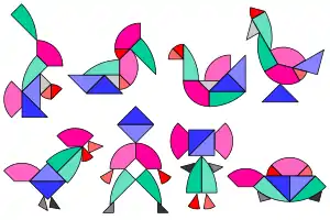 The Egg of Columbus (Ei des Columbus in German) is a dissection puzzle consisting of a flat egg-like shape divided into 9 or 10 pieces by straight cuts. The goal of the puzzle is to rearrange the pieces to form other specific shapes, such as animals (see below).
