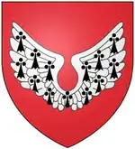 Arms of Reigny of Eggesford: Gules, a pair of wings conjoined ermine, as engraved on a bell in the tower of Eggesford Church [1]