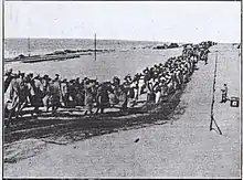 Beside the pipelines and the railway, hundreds of miles of wire netting roads were laid across the sand and pegged down, and great reservoirs, to hold huge quantities of water supplied by filters at a rate of 500,000 imperial gallons (2,000 m3) a day, were constructed. At the beginning of December 1916, the Egyptian Expeditionary Force had a strength of 150,000 British, Australian and New Zealand and 6,000 Indian troops, and 13,000 Egyptian labourers.[12][13]