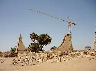 Temple structures were built on foundations of stone slabs set into sand-filled trenches.[92] In most periods, walls and other structures were built with large blocks of varying shape.[93][Note 5] The blocks were laid in courses, usually without mortar. Each stone was dressed to fit with its neighbors, producing cuboid blocks whose uneven shapes interlocked.[95] The interiors of walls were often built with less care, using rougher, poorer-quality stones.[96] To build structures above ground level, the workers used construction ramps built of varying materials such as mud, brick, or rough stone.[97] When cutting chambers in living rock, workers excavated from the top down, carving a crawlspace near the ceiling and cutting down to the floor.[98] Once the temple structure was complete, the rough faces of the stones were dressed to create a smooth surface. In decorating these surfaces, reliefs were carved into the stone or, if the stone was of too poor quality to carve, a layer of plaster that covered the stone surface.[99] Reliefs were then decorated with gilding, inlay, or paint.[100] The paints were usually mixtures of mineral pigments with some kind of adhesive, possibly natural gum.[99]