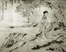 Liu Rushi (柳如是) is believed to have been born in Jiaxing, Liu was sold by her family as a concubine to the grand secretary Zhou Daodeng (周道登).[16] At the age of thirteen, a scandal led to her expulsion from Zhou's household, and she was sold to a gelou in Suzhou.[17] At seventeen, she had her first major love affair, with the painter Tang Shuda.[18] Already a noted poet and painter herself at this early age, she met Chen Zilong (陳子龍) in 1635 and lived with him for about a year, eventually leaving after his family disapproved of their liaison. After leaving Chen, she managed a gelou in Wujiang.[17][16][19] An affair with the artist Wang Janming ended when Wang failed to attend an appointment with her at the Rainbow Pavilion. Another affair with Song Yuanwen, a government official, ended when his vacillations over marriage resulted in Liu smashing her lute and storming off in a fit of pique.[18]