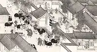 A number of poems have been written to immortalize Cai Wenji's life story including her own.[5] Liu Shang (c. AD 770), wrote a poem about Cai Wenji called Hujia Shiba Pai (胡笳十八拍; "Eighteen Songs on a Nomad Flute").[6] Liu Shang's poem accompanied by 18 scenes painted on a handscroll was commissioned by the first emperor of the Emperor Gaozong of Song. Four fragments, presumed to be of the original, are in the Boston Museum of Fine Arts, while the earliest complete copy, apparently from the fourteenth century and formerly in the C. C. Wang collection,[7] resides in the Metropolitan Museum of Art; these were published by the museum in 1974 in a book entitled Eighteen Songs of a Nomad Flute.[8]