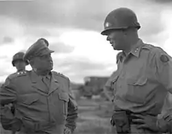 Lt. Gen. Walker (left) confers with Maj. Gen. William F. Dean, Commander Ground Forces in Korea, on 7 July 1950