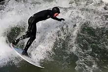 Just past a bridge near the Haus der Kunst art museum, the river forms a standing wave about one metre high which is a popular river surfing spot. The water is cold and shallow—sometimes only 40 cm deep—making it only suitable for experienced surfers and playboaters (whitewater kayakers). The wave is predominantly used by surfers, and animosities of surfers towards kayakers have occasionally been reported.[7]