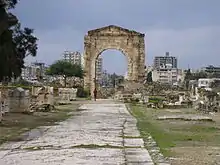 Over the course of the 6th century CE, starting in 502, a series of earthquakes shattered the city and left it diminished. The worst one was the 551 Beirut earthquake. It was accompanied by a Tsunami and destroyed the Great Triumphal Arch in El Buss.[18] In addition, the city and its population increasingly suffered during the 6th century from the political chaos that ensued when the Byzantine empire was torn apart by wars. The city remained under Byzantine control until it was captured by the Sassanian shah Khosrow II at the turn from the 6th to the 7th century CE, and then briefly regained until the Muslim conquest of the Levant, when in 640 it was taken by the Arab forces of the Rashidun Caliphate.[19]