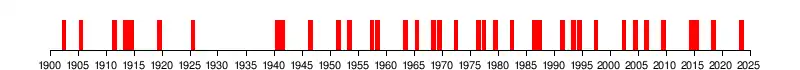 It is thought that there have been at least 30 El Niño events since 1900, with the 1982–83, 1997–98 and 2014–16 events among the strongest on record.[15][16] Since 2000, El Niño events have been observed in 2002–03, 2004–05, 2006–07, 2009–10, 2014–16,[15] 2018–19,[23][24][25] and 2023–24.[26][27]